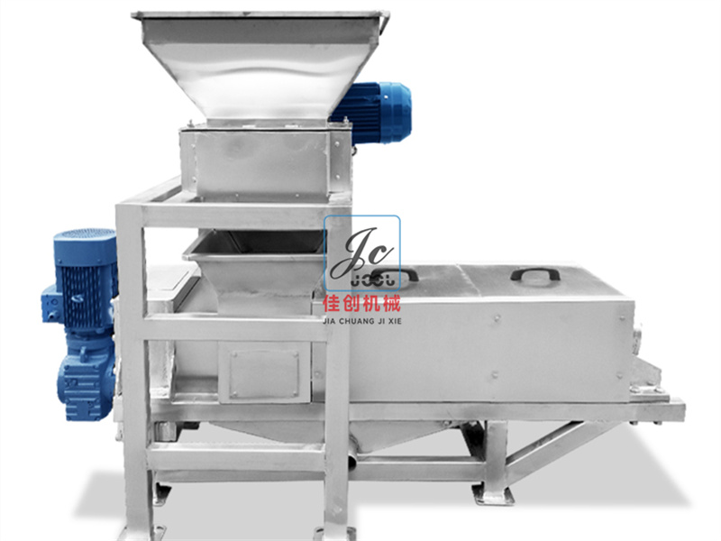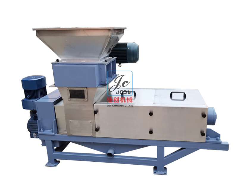 餐廚垃圾壓榨機中部設有進料箱,箱內(nèi)設有濾板。經(jīng)處理后的葡萄皮渣或果蔬送入箱內(nèi),即有部分汁液通過濾板自行流出;經(jīng)螺旋榨出的果蔬汁通過篩筒流進盛汁盤,再由出汁管流出;壓榨后的皮渣由篩筒末端的迫門排出。